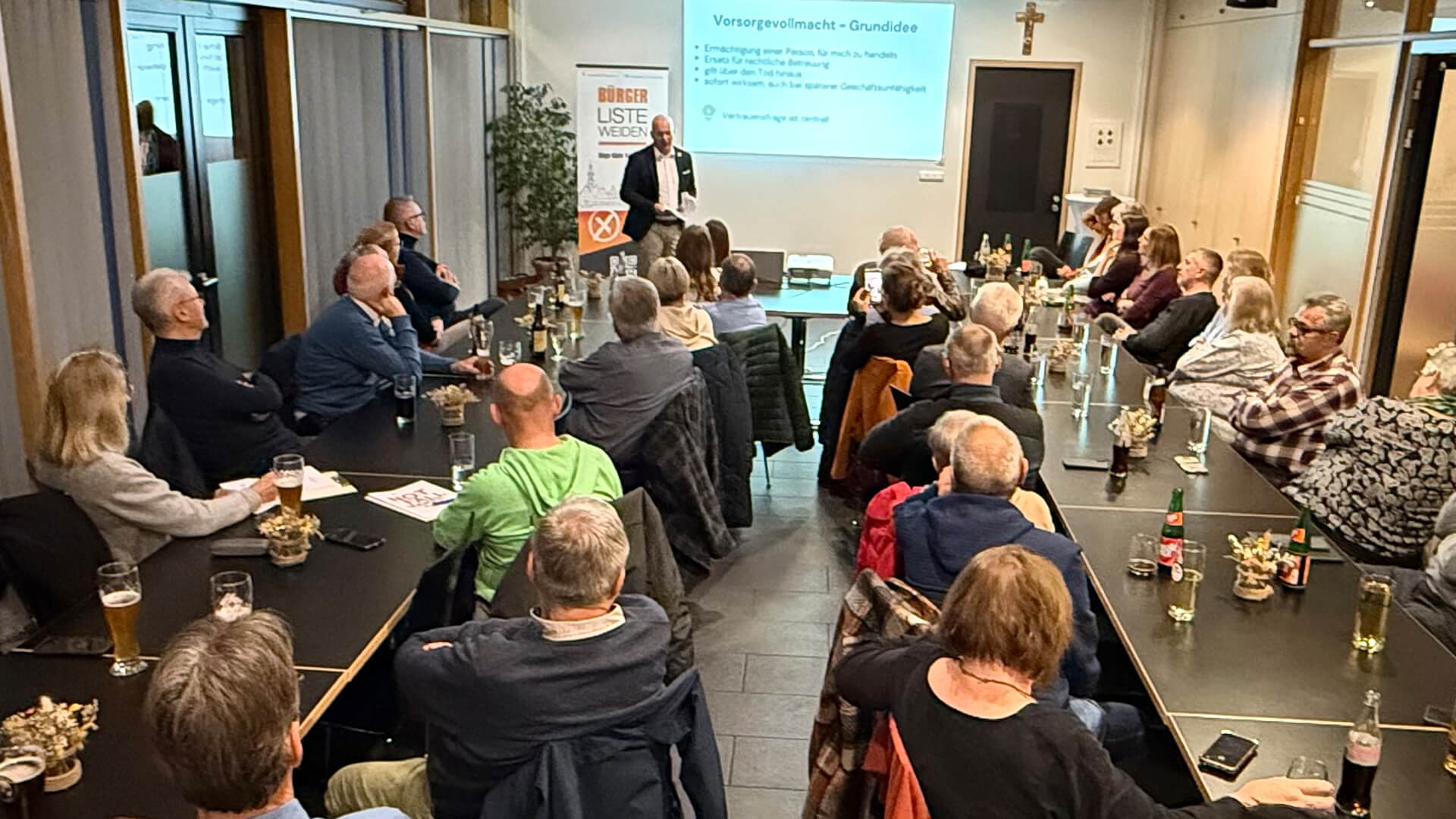 Rechtsanwalt und BL-Listenkandidat Clemens Sammet informierte die Gäste umfassend über die rechtlichen Aspekte von Patientenverfügung und Vorsorgevollmacht. Mit klaren Worten machte er deutlich, warum es so wichtig ist, rechtzeitig vorzusorgen und Entscheidungen nicht dem Zufall zu überlassen.